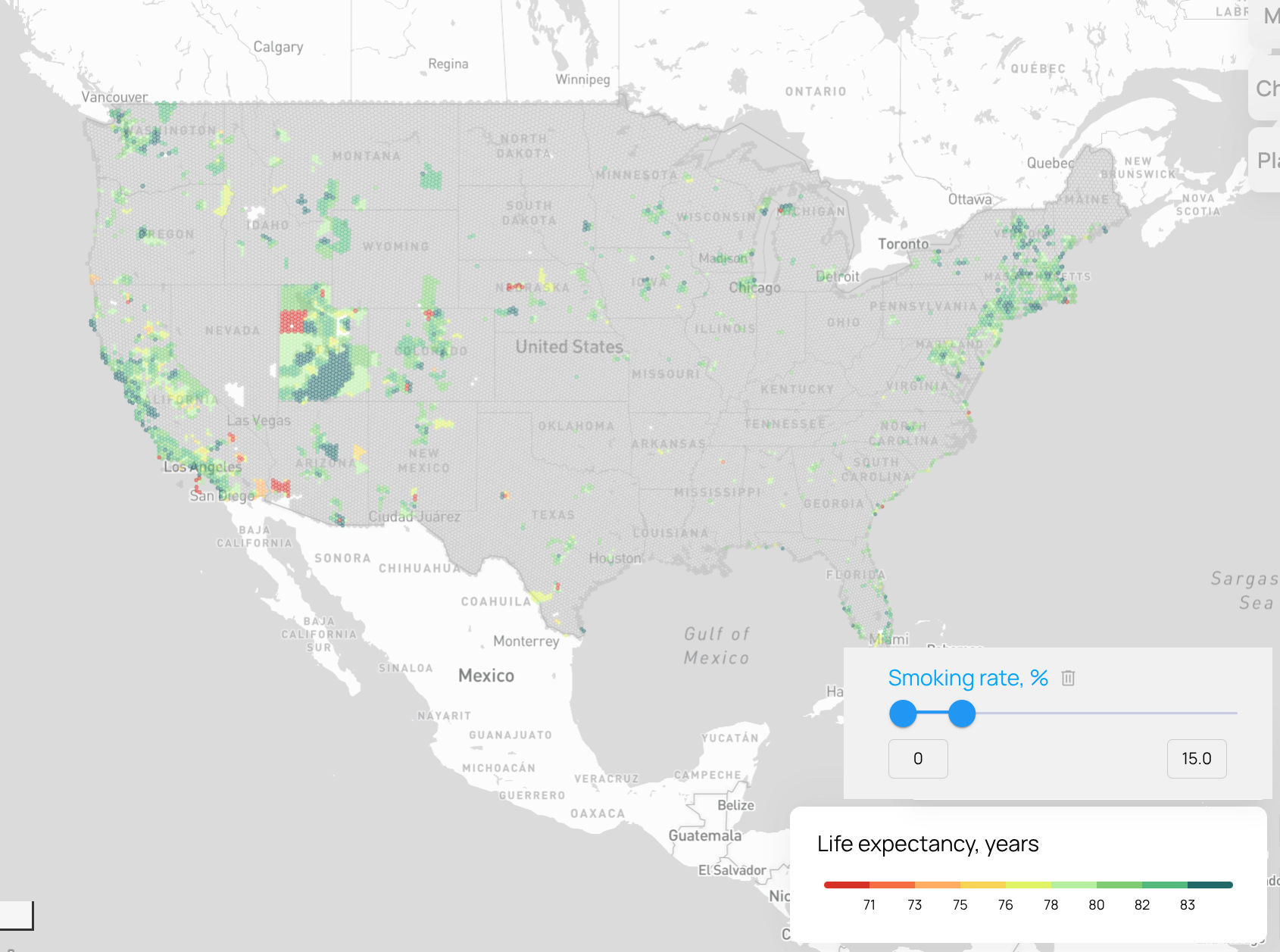 The detailed map also reveals strong correlation between life expectancy and smoking rate. Note how many yellow and red cells are there in the picture.