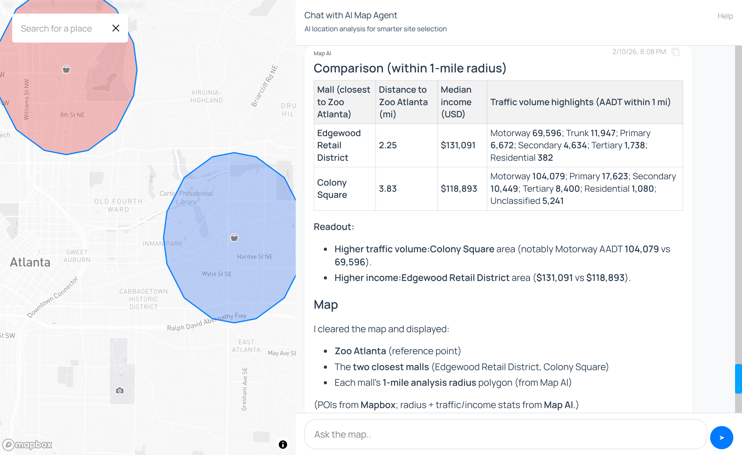 Map AI lets you analyze location data, visualize insights with custom filters, compare multiple locations, and generate detailed reports for any address or area (e.g. 1-,5-,10 mile). This all-in-one solution helps you make optimal and data-backed decisions for site selection, operations, and marketing.